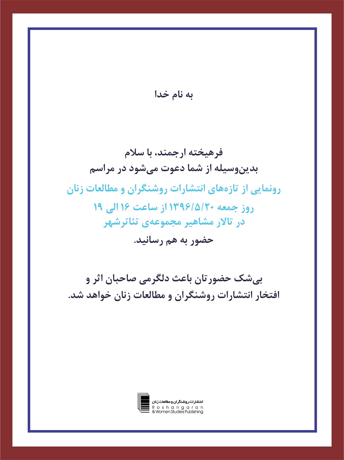 مراسم رونمایی و معرفی تازه‌های انتشارات روشنگران و مطالعات زنان، روز جمعه 20 مرداد 1396 از ساعت 16 الی 19 در تالار مشاهیر مجموعه‌ی تئاترشهر برگزار می‌شود.